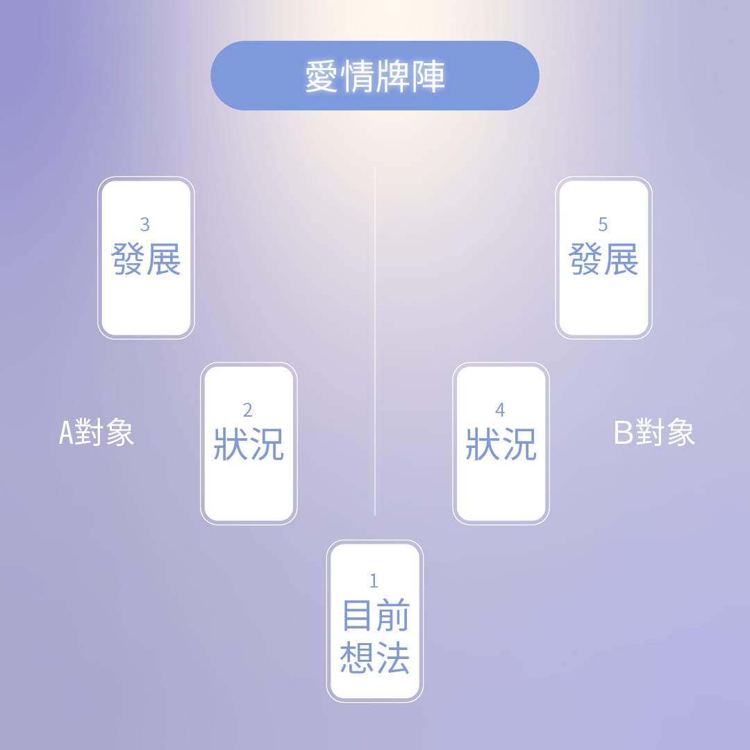 愛情牌陣(Love Spread):專門用於解答愛情相關的問題,了解彼此如何看待這段關係,以及感情的現狀和未來的可能性。
